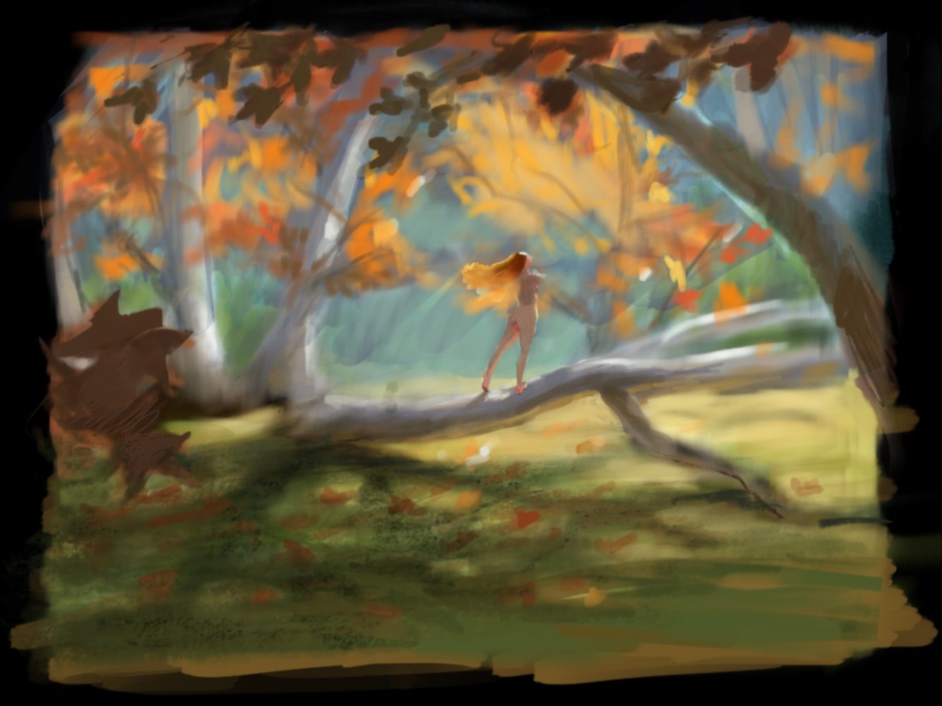 In this painting, again, we have two figures, but this time the realism is a bit more realistic. The figures and background have a three-dimensional style, the woman is drawn with more muscles and realistic anatomy, and there’s a slight indication of light and shadow. But the painting is still designed according to shapes; the trees and other elements in the background are presented as textures. For the scene to mimic reality more carefully, the background would be more random and full of details, the shape of the trees wouldn’t be so straight and designed, and overall it would draw too much attention and ruin the drama. Here we see how simplification and stylization serve to enhance the theme of the drawing.
